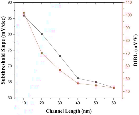 The simulated results for DIBL and SS versus different channel lengths are plotted in Figure 10. We present distinct trends in the SS and DIBL as the technology node shrinks for silicon-based CGAA-JLFET. Due to the improved electrostatic control, the SS becomes steeper, typically close to the ideal 60 mV/dec for larger nodes (40∼60 nm), while DIBL decreases, resulting in milder SCEs. However, smaller nodes (10∼30 nm) suffer from larger DIBL and shallower SS due to greater SCEs, resulting in more threshold voltage shifts and lower gate control. As a result, larger nodes (40 to 60 nm) provide better subthreshold performance and DIBL, resulting in less electric loss. When channels have extensive lengths, gate electrostatic control effectively seals leakage currents. When channels become shorter, the gate loses its capacity to fully regulate current, resulting in greater leakage in off-state mode [].