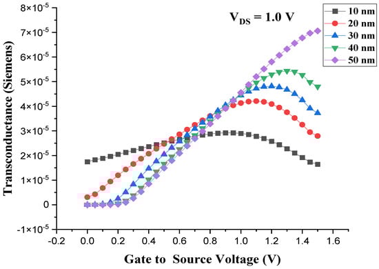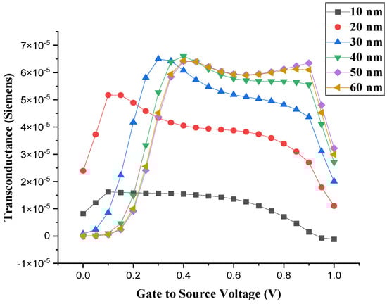 Figure 11 illustrates the channel length dependency of the Si-based CGAA-JLFET transconductance for different channel lengths ranging from 10 nm to 60 nm. As the technology node scales down, the transconductance of silicon-based CGAA-JLFET has been improved. For larger nodes (40–60 nm), higher transconductance is achieved because of enhanced electrostatic control and reduced SCEs, thereby enabling better current modulation as a function of gate voltage. However, smaller nodes (10–30 nm) exhibit more pronounced SCEs, resulting in lower transconductance and less efficient control over the channel current. Larger nodes exhibit higher transconductance because of better gate control and less leakage, making them suitable for high-end applications [].
