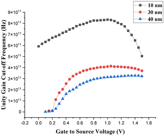 As such, from Figure 14, it is clear that the 10 nm channel length exhibits the highest unity gain cut-off frequency of all gate voltages, with the voltage rising from 0 to approximately 1.5 V. This implies that the switch time is faster with reduced SCEs of transistors, and the shorter channel length provides better gate control due to enhanced field penetration with an effective change in work function. At smaller dimensions, the influence of the gate controls the channel’s conductivity and improves its operating frequencies. Although a shorter channel length improves performance faster, it may also bring extra leakage currents and probably threshold voltage roll-off that may affect long-term operating transistors in its practical applications. However, the unity gain cut-off frequency decreases as the channel length increases to 30 and 40 nm. This is likely due to increased parasitic capacitances from the larger physical dimensions of the channel. Furthermore, longer channel lengths result in stronger SCEs that result in less gate control over the channel, lowering the device’s capability of switching at high frequencies. While the 10 nm transistor has a reduced cut-off frequency, the 30 nm and 40 nm transistors have a reduced cut-off frequency as well. These devices are less prone to leakage and provide closer to comparable dynamic stability as the 10 nm transistor, especially at higher gate voltages.
