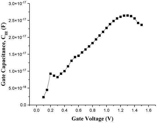Figure 15 illustrates gate capacitive variation against gate voltage for 40 nm CGAA-JLFET. In CGAA-JLFET, gate capacitance (Cgg) or gate-to-channel capacitance is one of the important parameters. The capacitance between the transistor’s gate and channel region is important in determining the device frequency response, switching speed, and other parameters. In CGAA-JLFET, Cgg depends on the 2D gate geometry, and the cylindrical gate enables stronger channel electrostatic control than in the planar devices. As channel length decreases, the gate capacitance increases since the gap between the gate and channel can be decreased. That makes the device better at controlling the current flow. While this increase in gate capacitance can cause higher parasitic delays, the resulting higher parasitic delays can be an issue for the transistor’s high frequency performance. Since Cgg directly affects transistor transconductance, cut-off frequency, and dynamic behavior in AC analysis, it is important to understand Cgg in AC analysis and to become as small as possible, which helps in having a minimum capacitive delay in high-speed applications.