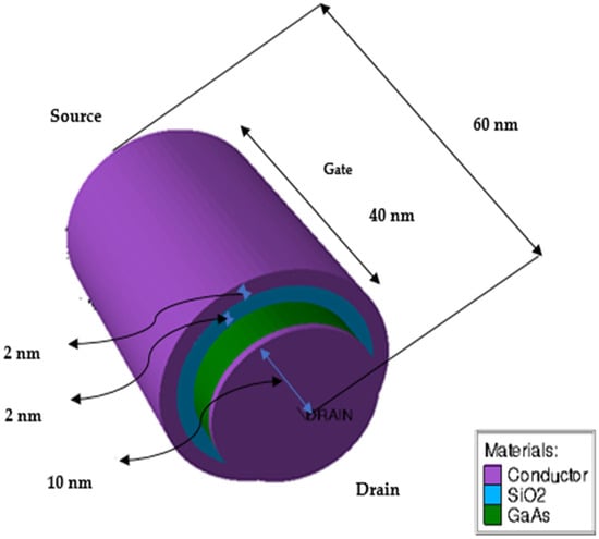- Hossain, N.M.; Quader, S.; Siddik, A.B.; Chowdhury, M.I.B. TCAD based performance analysis of junctionless cylindrical double gate all around FET up to 5nm technology node. In Proceedings of the IEEE 2017 20th International Conference of Computer and Information Technology (ICCIT), Dhaka, Bangladesh, 22–24 December 2017; pp. 1–4. [Google Scholar]