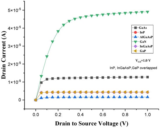 Output characteristics of 40 nm GaAs-based CGAA-JLFET with various channel materials.