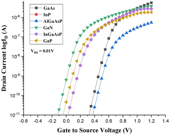 Figure 18 presents the simulated transfer characteristics of 40 nm different III–V material-based (GaAs, InP, AlGaAsP, GaN, InGaAsP, GaP) CGAA-JLFET and P+ polysilicon, which have been used to fulfill the high gate work function requirement to achieve an appropriate Vth value. The transfer characteristics of GaAs-based CGAA-JLFET yield faster on-to-off-state transitions because GaAs exhibits higher electron mobility than silicon-based CGAA-JLFET. GaAs devices demonstrate lower subthreshold swing characteristics and rapid switching processes; thus, they can operate effectively with reduced gate voltage requirements. However, silicon-based CGAA-JLFET demonstrates slower behavior between on and off states because of the decreased mobility of carriers.