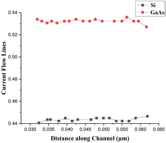 Current flow lines along the channel in 40 nm Si and GaAs-based CGAA-JLFET.
