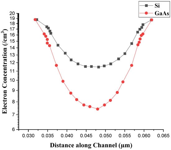 Electron concentration along the channel in 40 nm Si and GaAs-based CGAA-JLFET.