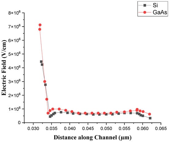 Electric field distribution along the channel in 40 nm Si and GaAs-based CGAA-JLFET.