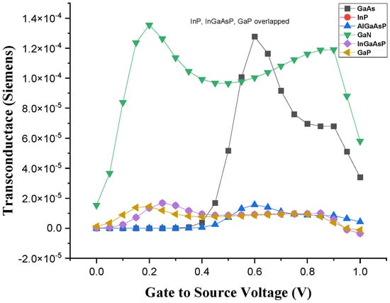 Figure 21 shows the electric fields of 40 nm silicon and GaAs-based JLFETs. A key element in evaluating the performance of any device is the electric field distribution, which is impacted by the material properties, doping profiles, and device structure. However, increased current mobility in GaAs-based JLFETs results in more concentrated and distinct electric field lines. The GaAs JLFET’s electric field distribution is less diffused and more concentrated around the gate region, allowing it to control the conduction process more precisely. Due to the wide bandgaps and high mobility of GaAs, GaAs-based devices use better electrostatic control, higher drive currents, and quicker electron transport than silicon devices [,]. Figure 22 demonstrates transconductance for different III–V materials-based (GaAs, InP, AlGaAsP, GaN, InGaAsP, GaP) channel materials.