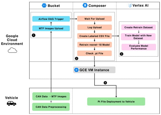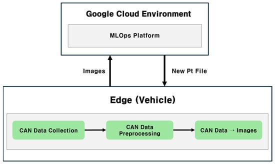 Figure 7 illustrates the overall cloud-based architecture workflow, starting with CAN data collection from the vehicle, where edge computing is used to convert time-series data into MTF (Markov Transition Field) images. These images are then processed in the Google Cloud environment, enabling automated model training and deployment.