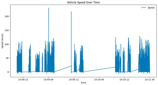 After addressing missing values, the vehicle’s driving data visualization revealed speed variations, as shown in Figure 2. The graph clearly illustrates a repetitive pattern of stopping and driving, where speed values approach zero during stationary periods and exhibit varied fluctuations during driving periods. Notably, sharp increases or decreases in speed indicate acceleration or deceleration events, providing valuable insights for analyzing driving patterns. Furthermore, the continuity of the data was preserved after processing missing values, which enhances the reliability of the analysis [].