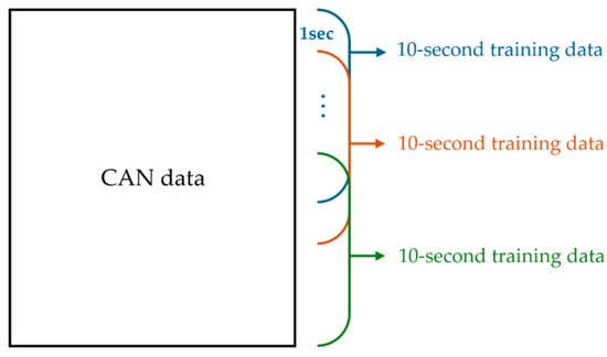 To more effectively capture changes in steering angle and driving speed while generating enough training data, each block’s starting point was shifted by 1 s instead of aligning with the end of the previous block, resulting in a 9-s overlap, as illustrated in Figure 3. This approach provides a data augmentation effect, allowing, for instance, the creation of 10 training image datasets from 20 s of data []. These overlapping blocks incorporate diverse temporal information, enhancing the generalization performance of the model. This method increases data diversity and enriches the training dataset, even within the same data sequence, ensuring more robust learning and improved classification accuracy [].