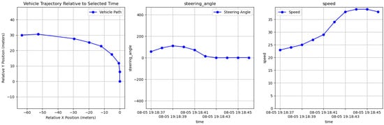The vehicle trajectory graph in Figure 4 visually confirms that the vehicle follows a left-turn trajectory, displaying changes in steering angle and speed over time. It also demonstrates that when the steering angle remains above a certain threshold, speed variations remain relatively stable. This verifies the consistency of steering and speed patterns during left-turn segments. Furthermore, utilizing GPS data, the vehicle’s actual trajectory can be tracked, visually indicating whether the system’s predicted driving condition aligns with the real-world trajectory.