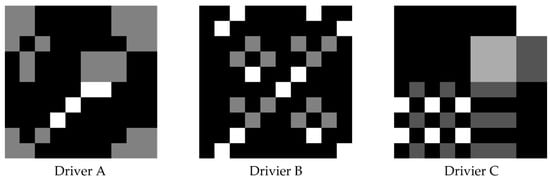 Figure 5 visualizes the right-turn scenarios of drivers A, B, and C over a 10-s period using the Markov Transition Field (MTF) technique, where we utilized the pyts (Python Time Series) library (version 0.12.0) to convert the time-series data into 10 × 10 images. This visualization incorporates data on the steering angle, vehicle speed, and the distance to the preceding vehicle. Notably, the distance to the preceding vehicle is capped at a maximum of 204 m, with a fixed value of 204 applied when no preceding vehicle is present. Consequently, only values below 204 were included in the visualization to accurately represent the characteristics of the distance maintained by the driver. Even for the same right-turn scenario, unique patterns for each driver emerged, highlighting that MTF images distinctly reveal individual driving habits, such as acceleration, changes in steering angle, and driving intervals during right turns.