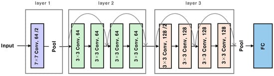 The ResNet (Residual Network) model was selected for driver classification for the following reasons []: ResNet utilizes residual learning, which enhances model stability when learning complex features, allowing it to effectively capture the fine-grained patterns necessary for classifying different driving conditions []. Although ResNet-18 has a relatively lightweight architecture, overfitting occurred despite reducing the number of epochs, primarily due to the limited size of the driver classification dataset. To mitigate this issue, the final layer (Layer 4) of the network was removed to further reduce model complexity. By removing this layer, the model retains the core concept of residual learning while being optimized according to the characteristics of the dataset, ensuring a more efficient and adaptable structure []. Figure 6 illustrates the architecture of the modified ResNet-18 model, where Layer 4 has been removed to achieve a more compact design tailored to driver classification.