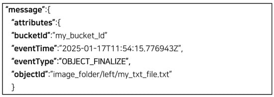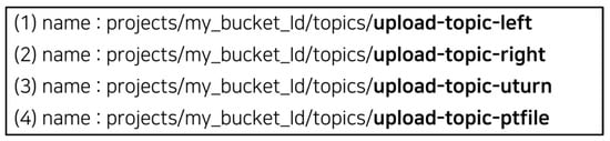 Step ➀ in Figure 7 is the image upload process, which triggers the training pipeline. The image files, generated using the method described in Section 2, are uploaded to a GCP Cloud Storage bucket with the filenames structured as <driver_driving condition>, supporting large-scale data storage and processing. Images are categorized into left, right, or U-turn folders based on the driving condition specified in the filename, and upon completion, a Pub/Sub message is generated to notify the system. Figure 8 displays a complete list of the generated Pub/Sub topics, while Figure 9 details Topic (1), showing an example of a message generated when an image is uploaded to the left-turn folder. The message payload contains metadata such as bucketId (storage location), eventTime (timestamp), and eventType (event occurrence type). Additionally, an empty text file is uploaded at the end of the process to trigger the “OBJECT_FINALIZE” eventType, signaling that the image upload has been successfully completed.