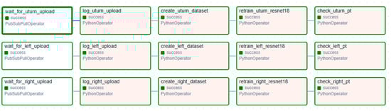 The [Retrain_resnet18] task triggers model retraining only when necessary, following Step ➂ in Figure 7. Instead of retraining upon every new data upload, the [log_upload] task first evaluates the model’s classification accuracy on the new dataset using Vertex AI Model Monitoring. If performance degradation is detected, the pipeline proceeds with the [Retrain_resnet18] task to update the model. Since Vertex AI requires a custom dataset, the CSV file created by the [create_dataset] task is loaded to structure the dataset. The training process is guided by a training script containing model parameters and hyperparameter settings (e.g., learning rate, batch size, and epochs). To ensure independent training pipelines for different driving conditions, separate retraining scripts were used for left, right, and U-turn scenarios. This structure allows each driving condition to be trained separately within the DAG pipeline.