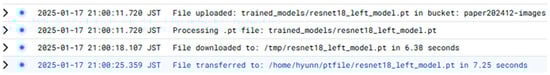 Log records and transfer time for the .pt file transmission from Cloud Functions to the VM instance.