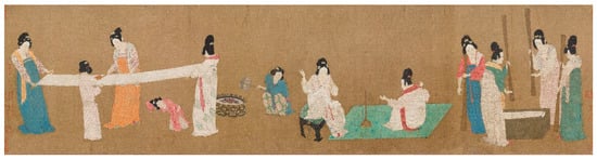 - Zhang, C. A Study on Women’s Clothing in Tang Dynasty Ladies Paintings. Master Dissertation, Yangzhou University, Yangzhou, China, 2022. [Google Scholar]