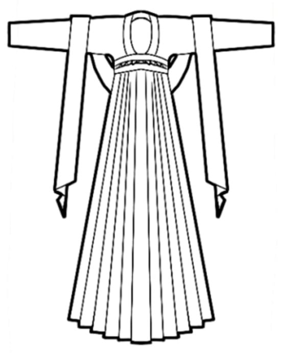 The ladies’ clothing of the prosperous Tang Dynasty inherited the clothing system of the early Tang Dynasty, including the upper robe, lower skirt, and tassel. The clothing styles of the restored objects include the upper robe, lower skirt (including waist bundle), and draped silk, as shown in Figure 2.