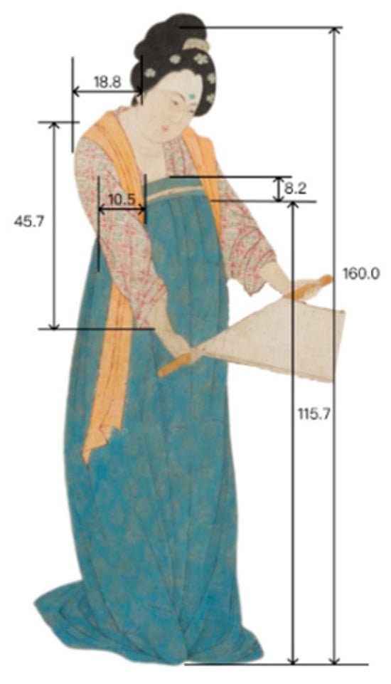 After the Tang Dynasty established its capital in Chang’an, it began to vigorously promote the customs of the Hu people. The northern region was also known for its martial arts, so being strong and healthy became the mainstream at that time. The book of Tang records that Princess Taiping, the daughter of Empress Wu Zetian, was “rich and powerful, with a broad forehead and ample resources. She had many powers and strategies, which she regarded as her own”. The trend of plumpness among the upper echelons naturally became the aesthetic trend of the people at that time, and the physical fitness of women in the prosperous Tang Dynasty had significantly improved compared to before. According to archaeological discoveries by scholars, the average height of women in the Zhengzhou area during the Tang Dynasty was 158.39 cm []. Based on the cultural aesthetics of the time and the analysis of the body shape of the ladies in the “ramming & washing silk painting”, the height of the ladies described in this article is set at 160 cm, with specific detailed dimensions shown in Table 1.