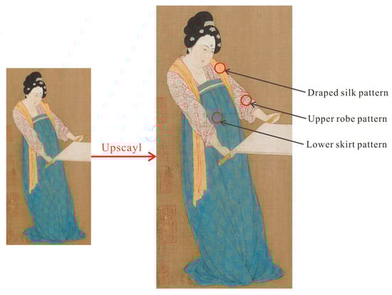 The main features of clothing patterns in Tang Dynasty are round and smooth shapes, dense compositions, complex rhythms, and dramatic momentum []. The most representative patterns include Baoxiang patterns, peony patterns, curled grass patterns, and entwined branches patterns. Observing the “ramming & washing silk painting”, it is difficult to clearly determine the pattern features of the lower skirt and draped silk. This article uses computer image processing and AI tools for pattern restoration. This study will first use AI tools to magnify local patterns for subsequent algorithms to clearly identify complex patterns. The results obtained through computer recognition will then be manually modified in conjunction with costume culture to ultimately obtain authentic and reliable patterns.