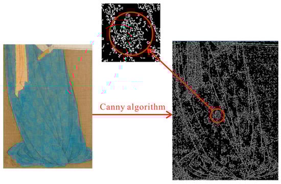 Secondly, using Python 3.8 programming tools, the Canny algorithm, which is an edge-detection algorithm proposed by John F. Canny in 1986, was applied to extract pattern information from the lower skirt. The Canny algorithm is widely used in the field of image processing, especially in digital restoration, computer vision, and pattern recognition. The Canny algorithm is known for its high accuracy, low error rate, and good edge continuity, making it highly suitable for edge detection in complex images such as ancient clothing patterns [].