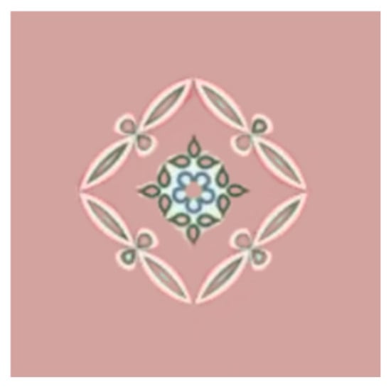 Finally, by observing the AI-repaired upper robe pattern, it was determined to be a diamond-shaped floral pattern. Clear pattern references can be found in the book “Ancient Chinese Silk Design Material Series”, with pink as the base and each edge of the diamond grid consisting of two leaves, filled with a radial symmetrical auspicious flower, and surrounded by an ivory white halo. The pattern composition is simple, the color matching is elegant, and the style is peaceful and beautiful, as shown in Figure 8.