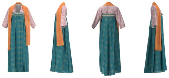 Based on the above analysis and research, the clothing patterns including upper robe, lower skirt, and draped silk are made by a pattern design system (PDS), which is an application of the Richpeace CAD V8A software, and stored in DXF format. We imported the clothing patterns into CLO 3D design software, and performed 3D digital restoration of the clothing through functions such as pattern filling, 3D arrangement, virtual stitching, fabric simulation, and combination wearing. The restoration result is shown in Figure 9.
