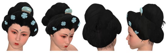 In the painting “ramming & washing silk painting”, the hair buns of the ladies are all high buns, belonging to the style of Bao buns, either tied on the top of the head or combed at the back of the head. In addition, ladies also have sideburns, which are the hair below the forehead and in front of the ears, to enhance the beauty of buns. Among them, cicada sideburns are the most vibrant sideburns in Chinese women’s hairstyles, which are very dynamic. We used Blender modeling software to create hairstyles and hair accessories and carving tools to display textures, imported appropriate textures to make the model more realistic, saved the model as an Obj format file and imported it into CLO 3D. Hairstyle restoration is shown in Figure 10.