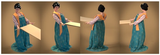 Applying digital technology for 3D virtual modeling and simulation of clothing, and carrying out digital restoration of traditional clothing, can not only achieve the repair of damaged clothing, but also improve work efficiency []. In recent years, many scholars have conducted digital restoration research on traditional clothing using 3D digital technology. Liu, K.X. et al. studied the style, structure, and size of the ladies’ dresses in the Hairpin Ladies’ Picture and used virtual fitting technology to restore the clothing []; Zhu, G.Z. et al. used digital technology to achieve three-dimensional digital restoration of Hakka cardigans and conducted a comprehensive evaluation of the restoration effect through a fuzzy comprehensive evaluation method []; Lin, C.J. mainly focuses on the form of music and dance costumes from the Qin Dynasty to the Qing Dynasty, and combines various methods such as literature review, image segmentation, 3D digital restoration, and questionnaire research to restore and study the form of costumes []; Zhu, C. et al. reconstructed the costumes of 12 ladies in the “ramming & washing silk painting” and summarized the overall idea of costume restoration, but lacked research on the details and restoration of the makeup []; Qiao, W. et al. used high-precision digital scanning and modeling techniques to digitally restore and explore costume in Qing Dynasty literati paintings []. It can be seen that digital technology has become one of the main means of restoring traditional clothing.