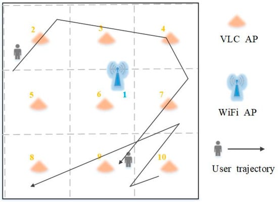 We consider a multi-user hybrid network with one WiFi AP and multiple VLC APs, as depicted in Figure 1. Let and denote the set of users and APs, respectively. The WiFi AP (denoted as AP 1), as a typical indoor RF technique, is deployed at the center. The VLC APs are deployed on the ceiling in a lattice topology. Specially, the number 1 indicates WiFi AP, and the number 2–10 indicates VLC AP. All the WiFi and VLC APs are linked via fiber to a central controller (CC), which takes charge of handover in this network. There is no interference between the WiFi and any VLC AP, while co-channel interference (CCI) exists where the coverage of the VLC APs overlap. We apply a frequency reuse factor of 4 to mitigate the CCI [9]. In addition, we use the time division multiple accessing to allow the APs to serve multiple users [11]. The widely used random waypoint mobility (RWP) [20] and geometric model [21] are employed to generate the user’s mobility pattern and link blockage, respectively.