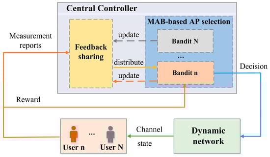 In the dynamic network, the handover process involves a sequence of AP selection decisions. This means that addressing the FHO issue boils down to finding the sequential APs that maximize the long-term reward. Here, the reward is defined as the user–AP connection time after the handover. In fact, the MAB is exactly the problem in which an agent decides which arm to pull in a number of rounds. In this regard, the AP selection problem for each user can be modeled as the MAB problem.