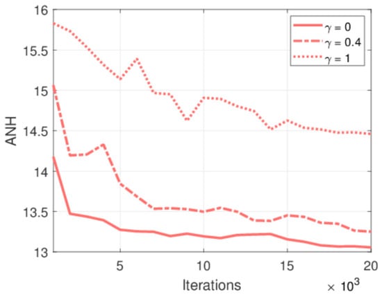 First, Figure 3 shows the convergence of the proposed COLH in terms of the ANH under different values (i.e., and ). Here, . We can see that COLH gradually converges under all values as the number of iterations increases. Nevertheless, under a larger value of , COLH converges to a higher ANH at a slower convergence rate. This is because the larger mobility randomness during the learning process of COLH requires more samples.