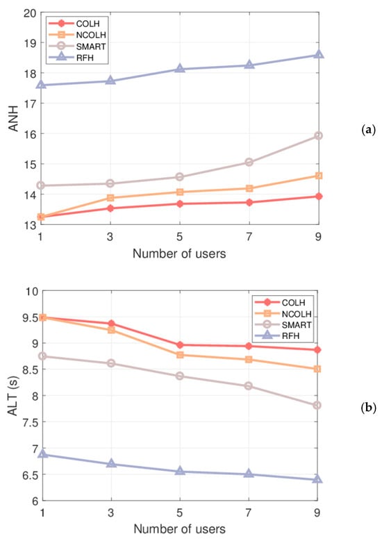 Comparison between (a) ANH and (b) ALT with different numbers of users.