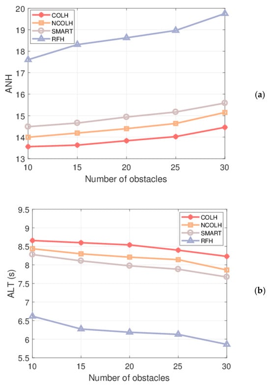Comparison between (a) ANH and (b) ALT with different numbers of obstacles.