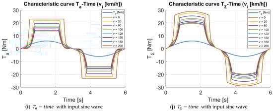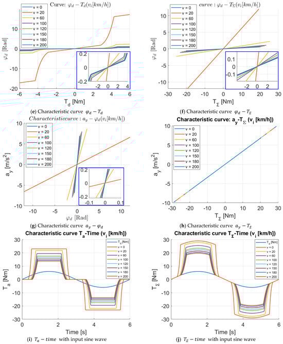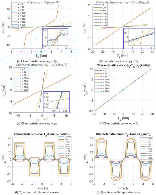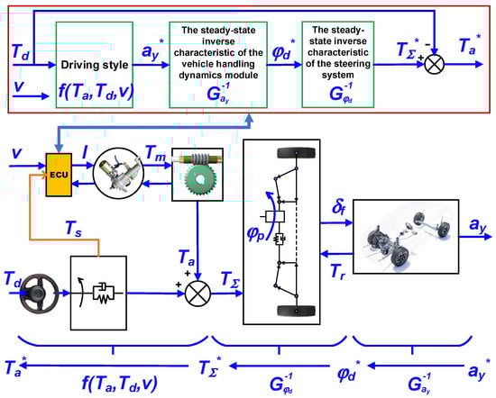 Where: —the power-steering characteristic function represents the relationship between ( and (), this is the function that defines the driving style; —the inverse lateral acceleration-driver angle transfer function; and —the inverse steering torque—driver steering angle transfer function. The asterisk (*) on symbols represents the desired value of the quantity with the corresponding symbol; the other symbols of the system are shown in the Appendix A.