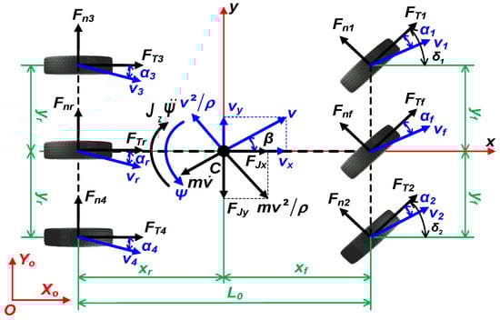 When the wheel angle is small (; ). Therefore, the tire side slip angles at the two axles are defined as follows: