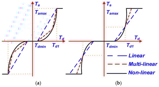 The EPS system can offer varying levels of assistance based on driving conditions. These control strategies include adjusting motor torque, steering ratio, and response characteristics to align with driver preferences and improve the characteristics of vehicle dynamics []. Notable research includes multi-map control, which utilizes different power-assist curves according to load and tire-road contact adhesion []. Zhang et al. [] present a mathematical model of the EPS system and analyze its characteristic curves. They discuss typical power curves that define the relationship between assist torque and steering wheel torque, emphasizing the importance of these curves in enhancing vehicle dynamics and driver comfort. The study provides a foundational understanding of EPS behavior. Li et al. [] focus on designing the assistance characteristics curve for EPS systems. They propose a method where the assist torque is proportional to the steering wheel torque, allowing for a constant road feel intensity. This linear relationship simplifies the control system design and adjustment. However, the approach may not adequately account for varying driving conditions, such as changes in vehicle speed or road surface, potentially leading to suboptimal steering assistance in diverse scenarios. Du and Liming [] introduce an assist characteristic curve design that considers load variations. Their method adjusts the assist torque based on vehicle load, enhancing steering performance under different loading conditions. Xue–Ping et al. [] propose a parametric design of the steering characteristic curve, focusing on the relationship between steering torque and vehicle speed. Their approach allows for dynamic adjustment of assist torque, improving steering feel across various speeds. Ciarla et al. [] explore the genesis of booster curves in EPS systems, analyzing how these curves influence steering feel and performance. They provide insights into the development of assist characteristics that balance driver effort and steering angle response. A relation between the assistance and the driver’s torque is provided, under the hypothesis of a position-oriented control of the movement and Stevens’ power law.