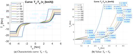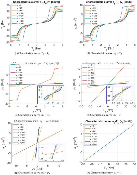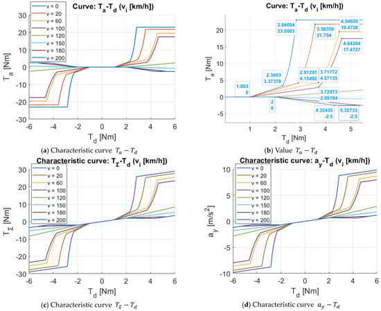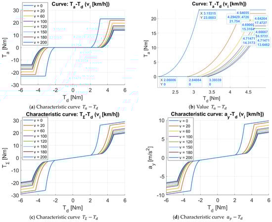 As mentioned above, during the steering process of the car, the driver has a clear perception of the car’s driving speed and steering movement intensity through the visual–vestibular system. The steering wheel torque is the driver’s demand and expectation for the car’s steering movement intensity; on the other hand, from the perspective of vehicle dynamics, when the car’s motion state reaches a steady state, the lateral acceleration ay and the pinion angle d are one-to-one corresponding, and the pinion angle d and the total steering torque acting on pinion Tsum are also one-to-one corresponding. For the power-steering system, the steering wheel torque Td and the steering assist torque Ta will also be stable at a certain value.