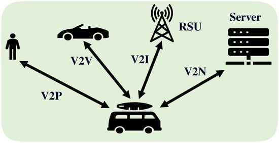 In the coming years, fifth-generation (5G) networks may face a drawback in meeting the desired quality of service (QoS) for vehicle-to-everything (V2X) communications, for example, due to limitations in resources, enormous traffic volume, and advanced digital devices and applications. In contrast, cutting-edge technologies are required to meet V2X QoS in terms of power consumption, latency-sensitive applications, achievable data rates, etc. []. Sixth-generation (6G) communication networks are expected to support intelligent transportation systems (ITSs) by meeting the broad-range requirements of V2X communications []. As shown in Figure 1, V2X communications include vehicle-to-network (V2N), vehicle-to-infrastructure (V2I), vehicle-to-vehicle (V2V), and vehicle-to-pedestrian (V2P) communications, including communications with vulnerable road users (VRUs) []. An example of a V2I link is a vehicle-to-roadside unit (RSU), where the RSU is a device that facilitates communications between vehicles and the transportation infrastructure in ITSs.