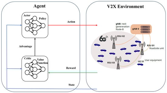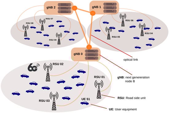 Sixth-generation V2X communications require ultra-high data rates (in Gbps) and reliability (99.999%), extremely low latencies (1 millisecond), high mobility, and ubiquitous connectivity. To fulfill these requirements, technological advancements are needed, including artificial intelligence (AI) and machine learning (ML) techniques, intelligent edge, terahertz communications, lower wavelengths, and higher frequencies []. The open radio access network (Open RAN) is a promising architecture to enhance and optimize the implementation of future 6G V2X networks. The open RAN deployment is based on disaggregated, virtualized, and software-based units, connected by open interfaces between multiple vendors []. The next-generation Node-B (gNB) functionality in Open RAN is disaggregated into a central unit (CU), a distributed unit (DU), and a radio unit (RU), connected via open interfaces to intelligent controllers that manage the network at near-real-time (10 milliseconds to 1 s) and non-real-time (longer than 1 s) time scales [].