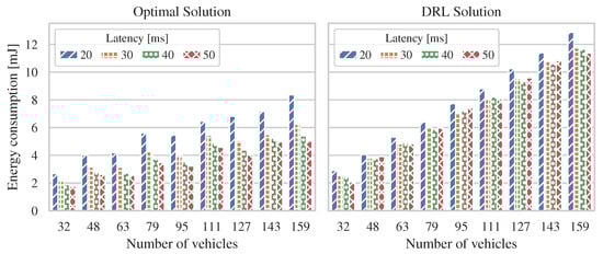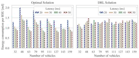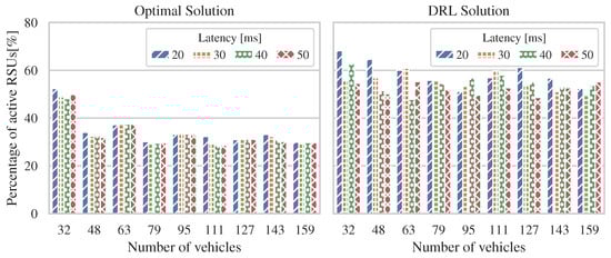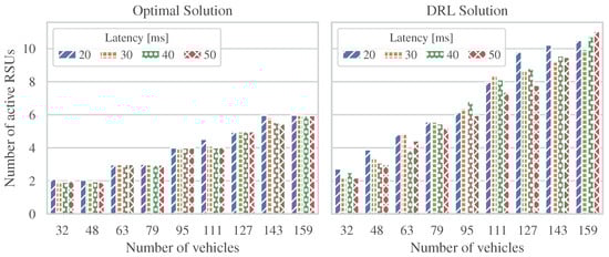 This section analyzes the performance of our proposed model by comparing optimal and DRL energy-efficient solutions for 6G V2X systems. In particular, we define different scenarios with a maximum number of RSUs, number of vehicles, and deployment area per scenario, as shown in Table 3, where the density of RSUs is 126 RSUs per km2, the density of vehicles is 1000 vehicles per km2, and the maximum allowed latency values range from 50 to 20 ms.