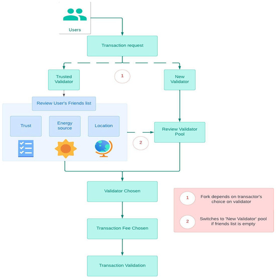 - Trusted Validator: This will be a validator who has once validated one of the user’s transactions already and meets the criteria in terms of geo-location, transaction success rate, and energy sources; they will be included in the ‘friend list’. Depending on the diversity of geographical location, transaction success rates and use of green energy the trust factor of the same node varies over time. Regardless, its trust value is higher than that of a New Validator.