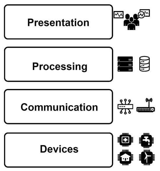 A typical IoT architecture [26] (Figure 1) is generally structured into four distinct layers: device, communication, processing, and presentation. The device layer is responsible for data gathering and includes sensors, microcontrollers, and other hardware components that may monitor an environment, such as temperature, humidity, motion, or health metrics. These devices are the core of an IoT network, providing the essential raw data required for further analysis and decision-making.