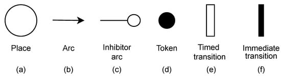 The proposed approach adopts a PN extension, namely, stochastic Petri nets (SPNs), which adopt probabilistic delays for timed transitions or zero delays for immediate transitions. In addition, guard expressions are also adopted to provide support for additional firing rules of transitions. Figure 2 shows the basic elements of SPNs. A place (Figure 2a) is represented as a circle and contains tokens (Figure 2d) to represent the current state of the system. SPN models also adopt arcs (Figure 2b) to directly represent the token flow through the places. In addition, inhibitor arcs (Figure 2c) allow a transition to fire when no tokens are present in its input place. SPN models consider two types of transitions, timed (Figure 2e) and immediate transitions (Figure 2f). Timed transitions are represented as rectangles, and their fire represents a stochastic delay associated with them to allow the modeling of probabilistic events. Black rectangles represent immediate transitions, and these transitions can be fired instantly when enabled, taking zero (0) time to be executed. The term stochastic Petri nets (SPNs) broadly refers to various stochastic extensions of Petri nets. For clarity, we adopt the term SPN throughout this discussion. The state space of an SPN model can be mapped to a CTMC, with simulation serving as an alternative approach to constructing CTMCs [6].