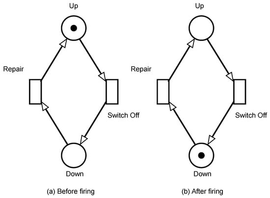 Figure 3 illustrates an example of an SPN representing a device that can be operational or not. In this model, the places correspond to the states Up or Down, and the transitions Repair and Failure represent the actions that change the state of the model. A token in place indicates that the device is operational (Figure 3a); in this state, the transition Failure is enabled.