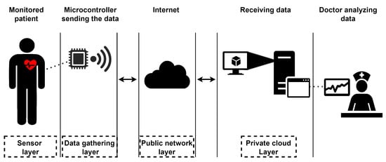 Figure 5 depicts the adopted IoMT architecture [31], which comprises four distinct layers. The sensor layer contemplates devices responsible for obtaining physiological data from patients, which are then collected by the data gathering layer (e.g., microcontrollers). The data transmission layer includes network components to transmit sensor data over the public network (i.e., the Internet). Lastly, the private cloud layer deals with data storage for analysis of healthcare professionals, and such a layer also provides mechanisms for managing the cloud computing infrastructure, including virtual machines.