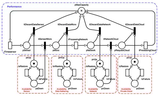 Transition tTimesensor denotes the frequency at which data are collected from a sensor, and a token in pSensor place indicates the respective data are ready. Immediate transition tiSensorMicro represents the activity for a microcontroller to collect the sensor data. The sensor and microcontroller are connected to the same board, and, thus, the delay is assumed to be negligible. Transition tiSensorMicro has an inhibitor arc that prevents data acquisition when the sensor is not operational (pSensor). Transition also verifies if the layer components are down. In case of failure, the request is lost (i.e., is fired). The interactions with other layers have similar behavior. For instance, transition represents data transmission over the Internet, and transition denotes data storage and processing by the private cloud layer. Table 2 presents comprehensive descriptions of the model’s components. To improve clarity, equivalent elements in different blocks have been grouped, with descriptions provided for each representative element.