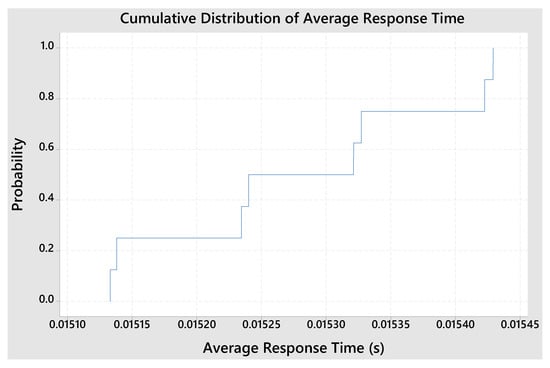 Figure 7 presents the cumulative distribution of the average response time of a system, where the x-axis represents the average response time, and the y-axis shows the cumulative probability associated with these times. The curve suggests that as redundant equipment is added, the system experiences slight improvements in response, reducing variability and ensuring more predictable response times. The slope of the curve indicates the relative frequency of the observed response times, with the final portion showing that most times converge to similar values, reinforcing the idea of increased system stability with the introduction of redundancies.