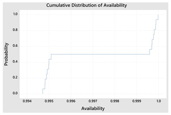 Figure 8 illustrates the cumulative distribution of availability, where the x-axis represents the availability of the system, and the y-axis shows the cumulative probability of achieving a given availability level. The curve indicates that as redundant equipment is added, the overall system availability improves, leading to higher reliability. Initially, there is a rapid increase in the cumulative probability, suggesting that a significant portion of the system operates within a certain availability range. As the availability approaches 1.0, the curve steepens, showing that a large proportion of observations achieve near-perfect availability. This trend confirms that redundancy contributes to increased stability and reliability, ensuring that system failures become increasingly rare.