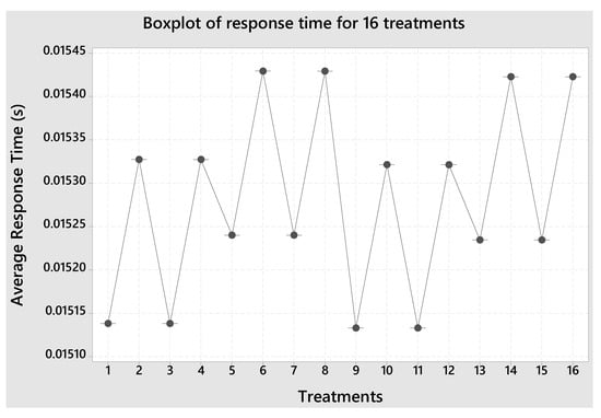Figure 9 presents the response times for all treatments considered, where each treatment represents a configuration with varying levels of redundancy. The x-axis denotes the response time, while the y-axis lists the treatment numbers. This figure visually summarizes the distribution of response times by displaying key statistical measures: the box represents the interquartile range (IQR) (the middle 50% of the data), the line inside the box indicates the median, and the whiskers extend to the minimum and maximum values within 1.5 times the IQR. Outliers beyond this range are shown as individual points.